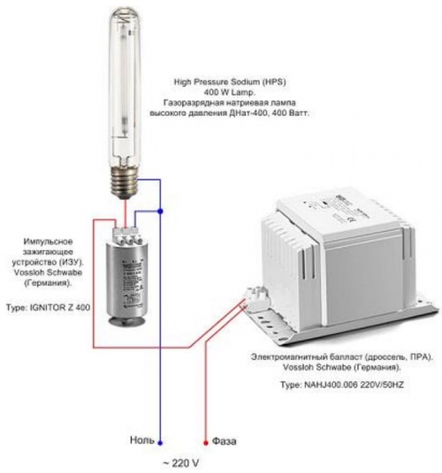 Найпоширенішими ПРА виступають баластні індуктивні дроселі, які необхідні для обмеження і стабілізації струму. Необхідний баласт, який скоммутірован з лампою за потрібне чином, вже є в них, тому схема підключення натрієвих ламп зводиться виключно до подачі на клеми світильника напруги живлення.