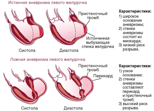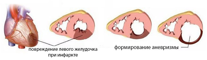 Тиск крові призводить до того, що истонченная область серцевого м'яза поступово і постійно випинається назовні - подібне випинання і носить найменування аневризми. Таке патологічне утворення в більшій частині випадків локалізується в стінках саме лівого шлуночка.