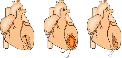 - У першому випадку випинання без розкриття, а як би занурюється в стінку серця за допомогою швів, які фіксують його до самого міокарду. Така операція застосовується при середніх розмірах аневризми, яка не сильно випинається назовні і не сильно підноситься над поверхнею серця. Оперативний доступ не вимагає розтину стінки серця.