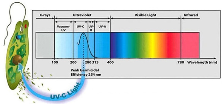 За останні 30 років установки з ультрафіолетовими лампами допомагають очищати питну воду від більш ніж 60 видів хвороботворних мікроорганізмів, бактерій, водоростей (цвілі). Ультрафіолетові хвилі довжиною 205-315 нм мають бактерицидний ефект. Експериментальним шляхом визначили, що довжина хвилі ультрафіолетового випромінювання в діапазоні 254 ± 10 нм (жорсткий ультрафіолет) ефективно рве внутрішні ланцюжка ДНК і РНК шкідливих мікроорганізмів, не дозволяючи їм розмножуватися. УФ з довжиною хвилі в 265 має максимальну бактерицидною ефективністю, що дорівнює 1 (одиниці). Ультрафіолет не діє на деякі бактерії, деякі види грибів і пріони.
