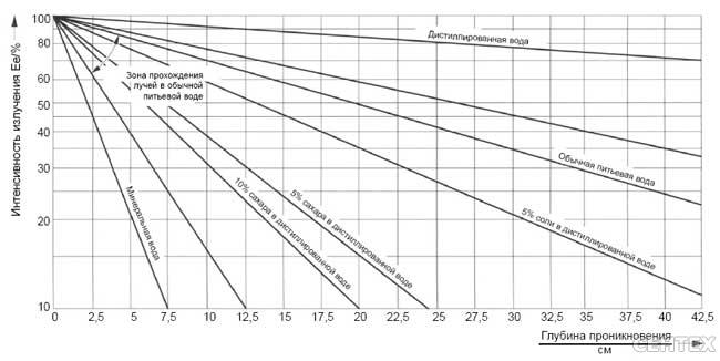 Графіки глибини проникнення УФ випромінювання, потужності і кількості знезаражують води