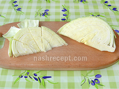 - Капусту через верх розрізаємо на дольки (як кавун). Ширина однієї дольки повинна бути близько 3 см. Вирізуємо качан. Кожну часточку розрізаємо впоперек через центр так, щоб вийшли пірамідки.
