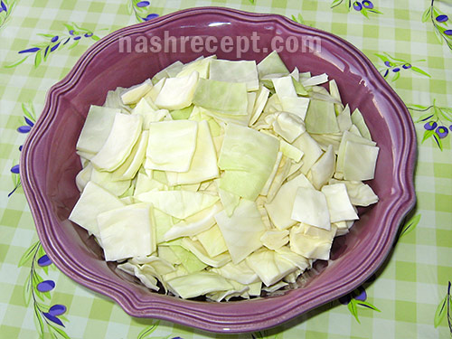 - Порізану капусту розбираємо на окремі листочки - «пелюстки». Виходять невеликі квадратики або прямокутники, розміром 3 × 4, 3 × 3 або 2 × 3 см.