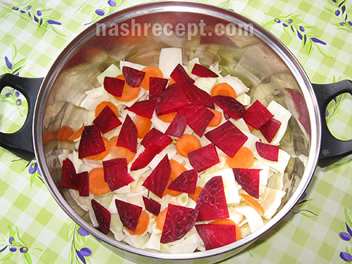 - У глибоку каструлю або миску (можна і в банку) викладаємо шарами капусту, моркву, часник, буряк. Знову капусту, моркву, часник, буряк - таким чином викладаємо все овочі.