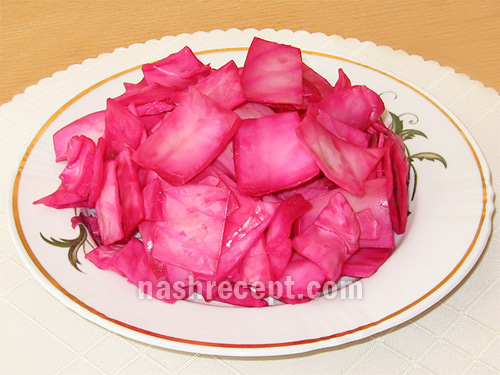 - Капусту на добу залишаємо маринуватися при кімнатній температурі. Потім переставляємо в холодильник і залишаємо ще на добу - маринована капуста «Пелюстки» готова.