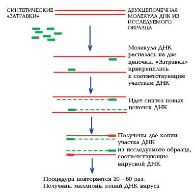 Отже, фрагмент нуклеїнової кислоти знайдений, але він один і для проведення реакції його явно недостатньо, тому він кодується (копіювання). Однак для подальшого процесу необхідна велика кількість таких мікроучастков, що може забезпечити його розмноження шляхом добудовування нових, ідентичних знайденому фрагменту, ділянок ДНК (реплікація). Розмноження є природним і невід'ємним властивістю нуклеїнової кислоти, яка буде реплицироваться за допомогою ферменту полімерази навіть поза живим організмом (в пробірці з пробою), утворюючи безліч клонів, тобто, піде ланцюгова реакція. Клонувати будуть все нові і нові фрагменти, але тільки ті, в яких зацікавлений дослідник. Ось чому так важливо взяти «чистий», без сторонніх домішок аналіз, а тест проводити дуже акуратно.