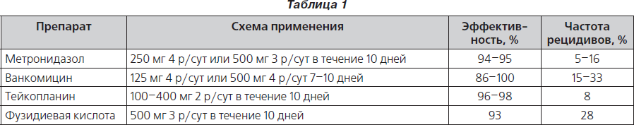Основним винуватцем такого тяжкого стану є Clostridium difficile, грамположительная спороутворююча анаеробна бактерія, збудник, який відповідає практично за 100% випадків ПМК, 50-75% випадків AAД з колітом і 5-25% випадків AAД без коліту. Частота екзогенної колонізації цим збудником безпосередньо залежить від тривалості лікування хворого в стаціонарі (збільшуючись приблизно на 10% кожний наступний тиждень) і призначеного антибіотика. Серед антимікробних препаратів, застосування яких відносно часто ускладнюється розвитком ААД, переважають цефалоспорини, кліндаміцин, ампіцилін і амоксицилін, інші пеніциліни, еритроміцин та інші макроліди, тетрациклін, триметоприм / сульфаметоксазол. Рідко ААД викликають тикарциллин / клавуланат, хлорамфенікол, амфотерицин В, хінолони, рифампіцин, аміноглікозиди, сульфаніламіди. З факторів, що привертають до розвитку маніфестних форм, необхідно відзначити екзогенне інфікування (головним чином госпіталізованих пацієнтів), порушення мікробіоценозу кишечника внаслідок попередньої АБТ, вік старше 60 років, супутні захворювання (опікова хвороба, уремія, лейкози і ін.), Імуносупресію, прийом інгібіторів протонної помпи та інших антисекреторних препаратів, харчування через зонд. Якщо для лікування антибіотико-асоційованого коліту зазвичай достатньо припинити вживання антибактеріального препарату, який спровокував розвиток хвороби, проведення підтримуючої терапії, спрямованої на відновлення водно-електролітного балансу, і непризначення препаратів, що знижують перистальтику кишечника, то при ААД, викликаної Clostridium difficile, ці заходи будуть ефективні тільки в 15-25% випадків. Препаратами вибору в терапії ААД є метронідазол (перорально) або ванкоміцин (перорально). Оскільки останнім часом збільшується частота виділення ентерококів, резистентних до ванкоміцину, його використання в якості препарату першої лінії в терапії ААД не рекомендується (табл. 1).