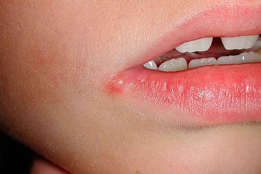У другому випадку, вірус поширюється біля рота. Спочатку дитина відчуває свербіж на губах, потім з'являється червона пляма або навіть кілька. На їх місці через 1-2 дня утворюється пухирець з рідиною. Він болить і свербить. Діти не можуть впоратися з бажанням потерти хворе місце, тому вірус поширюється далі, болячки збільшуються в розмірах. Бульбашки лопаються, засихають і зникають за 3-5 днів. Якщо не заспокоювати свербіж, що не підсушувати їх, то хвороба затягнеться на кілька тижнів.