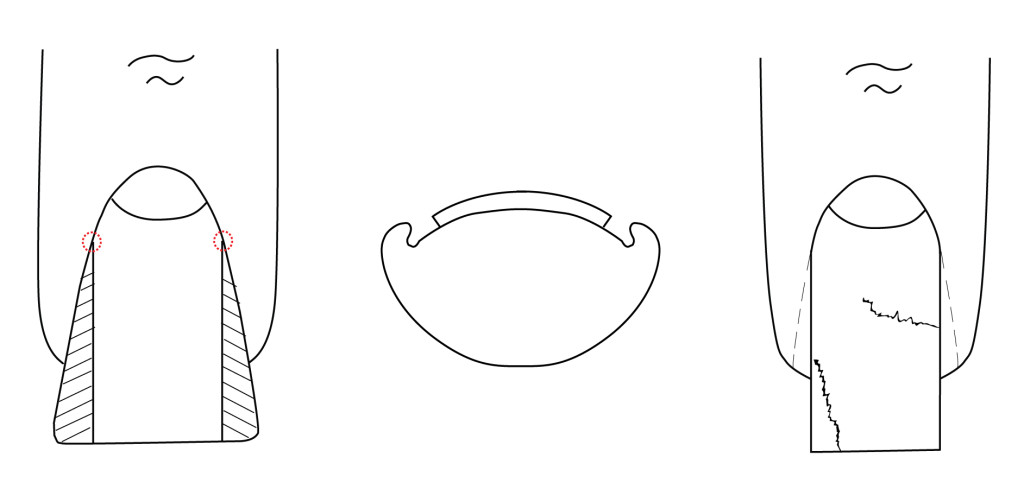 [Icon position = "left" size = "1" bg = "false" ficon = "icon-minus-sign»] Щільне прилягання збоку нігтя до ложу на руці позбавляє нас можливості встановити коригувальну скобу, полускобу, а клейові пластини не будуть довго триматися і не дадуть очікуваного результату. Навіть якщо вийде поставити скобу, великий ризик, що клієнт за щось зачепиться і зірве її з частиною нігтьової пластини.