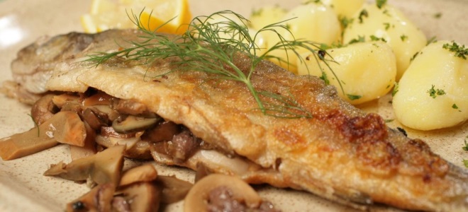 Почищену і підсушену рибу наріжте порціями, посоліть, змастіть з потовченим часником і залиште на 1-2 години в холодному місці. Дно посуду вистелити нарізаною цибулею і нашаткованими вареними грибами. Покладіть рибу, перекладаючи її цибулею і грибами так, щоб верх був покритий цибулею, залийте відваром з грибів, змішаним з маслом і гірчицею, накрийте і запікайте в духовці протягом години. Перед подачею викладіть на тарілку, полийте соусом, який утворився під час запікання, посипте нарізаною зеленню петрушки. Навколо обкласти картоплею, звареною в мундирі, почищені та підсоленим.