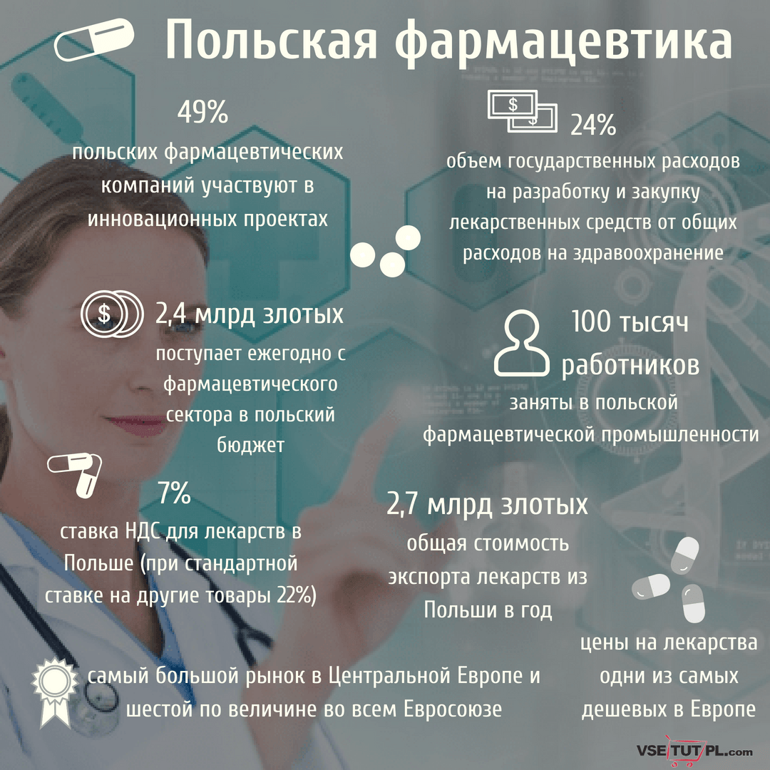 Крім того, ставка ПДВ для ліків в Польщі становить 7% (при стандартній ставці на інші товари 22%). Як наслідок, сьогодні в Польщі ціни на ліки одні з найдешевших в Європі.